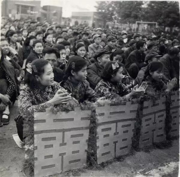 1953年10月18日,记者于嘉祯在天津市第六区棉纺厂选区选举大会上拍摄到的群众局部图,图中端坐前排的女工们脸上的笑容和手中扶着的“喜”字,是对其内心深处因获得平等民主权利产生喜悦心情的真实描述。