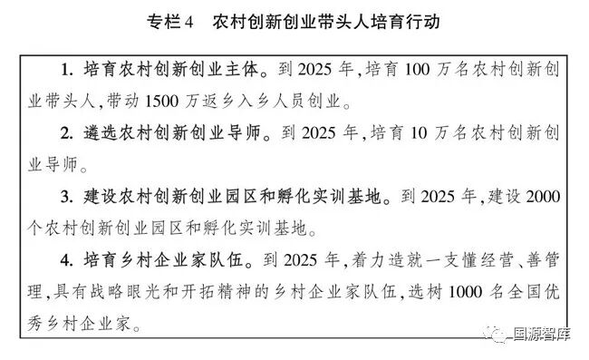 培育入乡创业主体。优化乡村营商环境,强化政策扶持,构建农业全产业链,引导大中专毕业生、退役军人、科技人员和工商业主等入乡创业,应用新技术、开发新产品、开拓新市场,引入现代管理、经营理念和业态模式,丰富乡村产业发展类型。