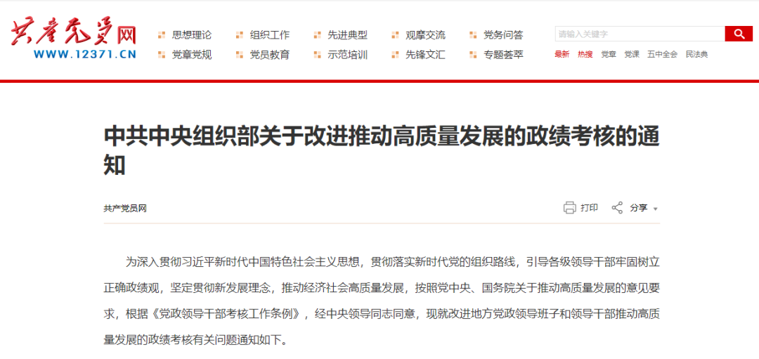 为深入贯彻习近平新时代中国特色社会主义思想,贯彻落实新时代党的组织路线,引导各级领导干部牢固树立正确政绩观,坚定贯彻新发展理念,推动经济社会高质量发展,按照党中央、国务院关于推动高质量发展的意见要求,根据《党政领导干部考核工作条例》,经中央领导同志同意,现就改进地方党政领导班子和领导干部推动高质量发展的政绩考核有关问题通知如下。
