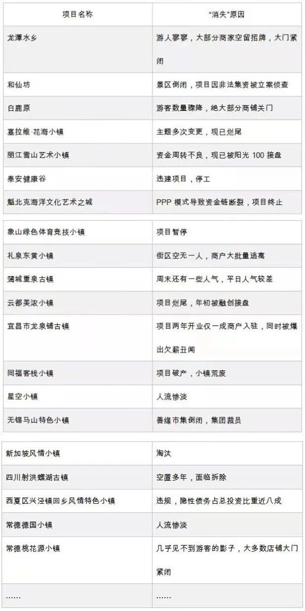 名单列举了一些资金链断裂、商户逃离甚至沦为“空城”的特色小镇与其“消失”的原因。随后,对于名单上部分特色小镇曾经的大手笔投资和火爆场面与现在的落寞凋敝,一些媒体进行了图文并茂的对比,令人倍感唏嘘。