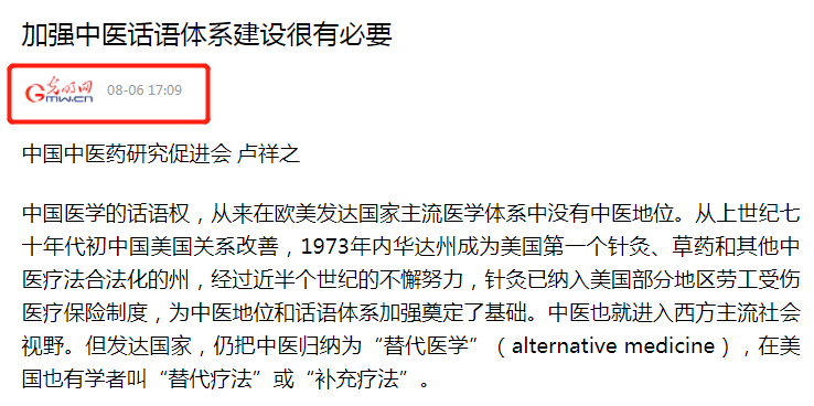 中国医学的话语权,从来在欧美发达国家主流医学体系中没有中医地位。从上世纪七十年代初中国美国关系改善,1973年内华达州成为美国第一个针灸、草药和其他中医疗法合法化的州,经过近半个世纪的不懈努力,针灸已纳入美国部分地区劳工受伤医疗保险制度,为中医地位和话语体系加强奠定了基础。中医也就进入西方主流社会视野。但发达国家,仍把中医归纳为“替代医学”(alternative medicine),在美国也有学者叫“替代疗法”或“补充疗法”。