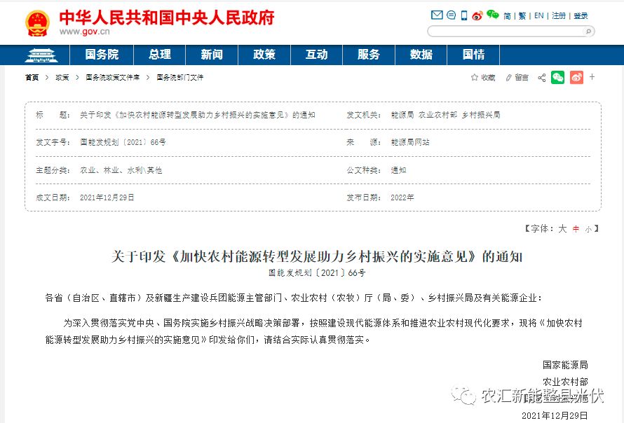 鼓励地方政府加大力度支持农民利用自有建筑屋顶建设户用光伏,积极推进乡村分散式风电开发。统筹农村能源革命与农村集体经济发展,培育农村 能源合作社等新型市场主体,鼓励村集体依法利用存量集体土地通过作价入 股、收益共享等机制,参与新能源项目开发。鼓励金融机构为农民投资新能 源项目提供创新产品和服务。二、2021年12月29日,农业农村部,国家能源局、国家乡村振兴局联合发布《加快农村能源转型发展助力乡村振兴的实施意见》